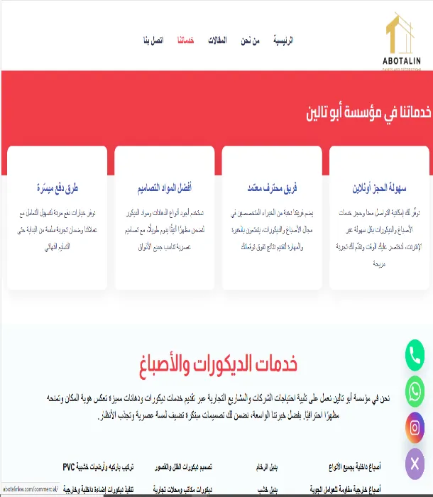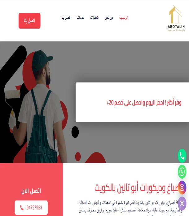 قمنا في A-M Media بتصميم وتطوير موقع إلكتروني احترافي لمشروع أبو تالين المتخصص في أعمال الأصباغ والديكورات في الكويت، ليكون منصة رقمية تعبّر عن جودة التنفيذ ودقّة التفاصيل. ركّزنا على تصميم أنيق وسريع يبرز نماذج الأعمال بشكل احترافي، مع تجربة مستخدم سهلة تتيح للزائر الوصول للخدمات وطلب التواصل خلال ثوانٍ، مما ساعد على تعزيز ثقة العملاء وزيادة فرص التعاقد عبر الموقع.